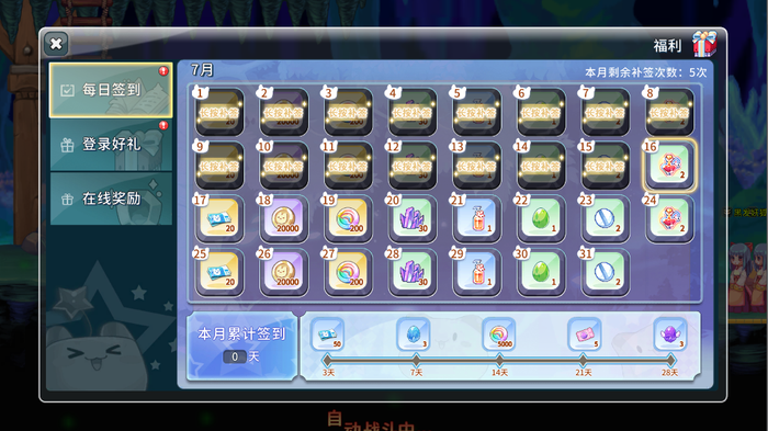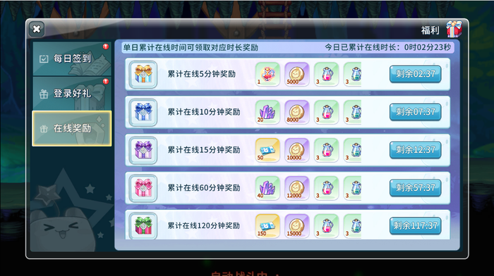 3、在线奖励:每日登录后,根据在线时间长度领取奖励,从五分钟、十分钟、十五分钟、六十分钟、一百二十分钟五个档位,达到所在时间领取对应奖励,奖励大多为补给药水、金币、强化石、绑定点卷这些。
