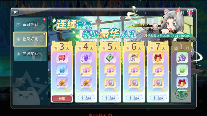 2、登录好礼:每天登录就可以领取的奖励,连续天数越高,奖励越丰富,奖励大多为卡片抽奖卷、福利玩具宝箱、蜜糖锤、创意理发卷、强化石、药水补给这些。