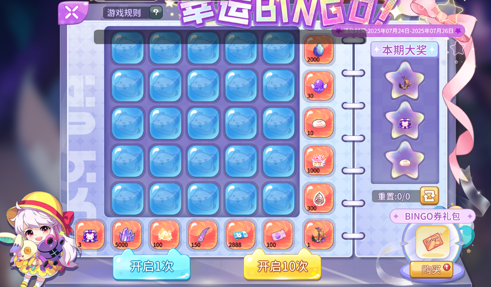 1.每次抽取幸运Bingo消耗对应数量的Bingo券; 2.达成5格横、竖、斜线5格Bingo连线时可获得对应位置的额外奖励,每个额外奖励只可获得一次; 3.Bingo券可在礼包内进行购买; 4.概率公示(格子从左到右从上到下序号递增。 例如:第一行最左边格子序号1,第二行最左边格子序号6): 序号1:3.28%;序号2:8.20%;序号3:0.66%;序号4:6.55%;序号5:1.63%;序号6:8.20%;序号7:3.28%;序号8:8.20%;序号9:3.27%;序号10:6.55%;序号11:0.81%;序号12:1.64%;序号13:0.66%;序号14:1.64%;序号15:8.20%;序号16:3.28%;序号17:0.32%;序号18:3.28%;序号19:1.64%;序号20:8.20%;序号21:0.49%;序号22:8.20%;序号23:3.28%;序号24:8.20%;序号25:0.33%。 本次活动时间: 7月24日到7月26日。 活动奖励有: 宠物箱、强化石、卡片抽奖卷、绑定点卷、精炼石、宠物药、宠物蛋.....(每次活动不一定,大致列举一些,更多内容游戏内了解。) binggo卷获取方式: 1、每天可以免费领取两张; 2、其他的可以用点卷的方式获取。 |